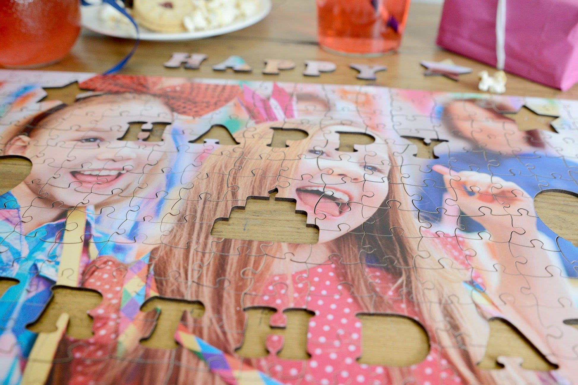 This Happy Birthday themed jigsaw has the words "Happy Birthday" spelt out in shaped pieces in the jigsaw.